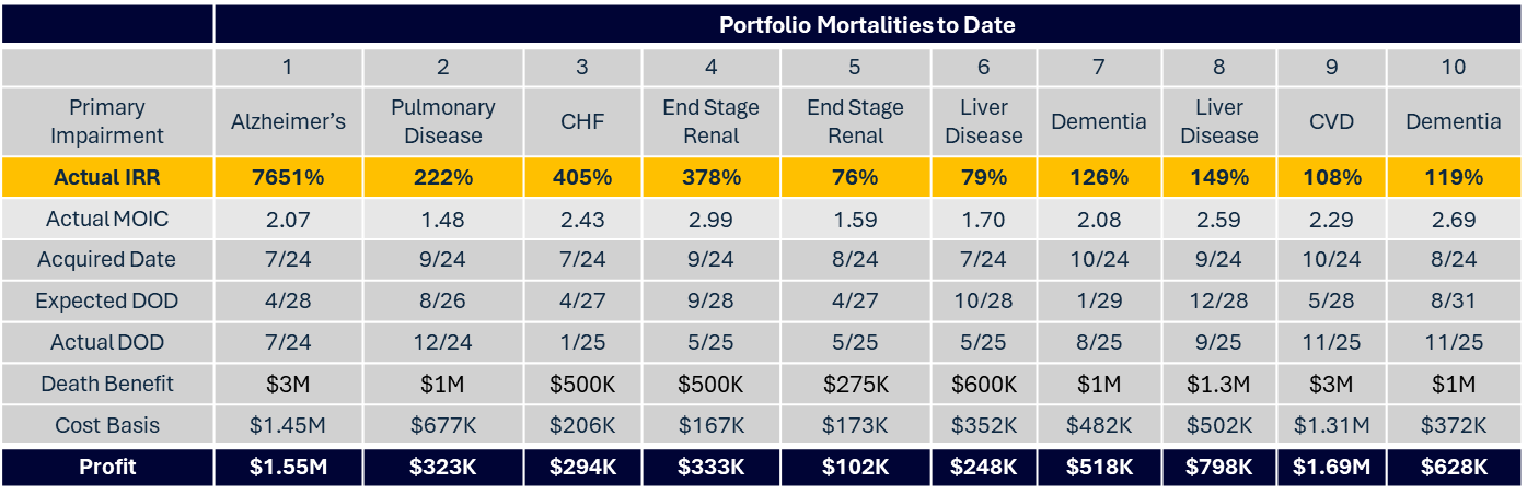 Dynamic Life has priced and underwritten policies representing approximately $50M in a strategic investment. Certain policies from this investment may be identified1 and used for immediate deployment. Our strong relationship with originators and the advanced stage of policy readiness can significantly accelerate capital deployment and help minimize the cash drag often associated with the asset class.